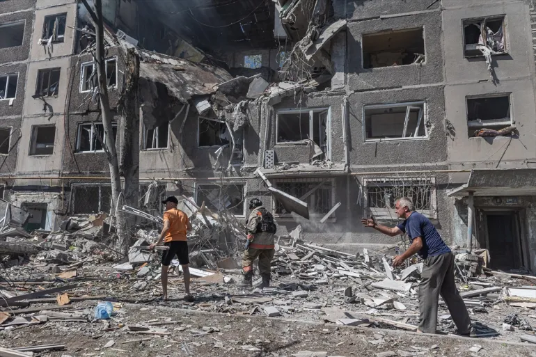 Emergency service workers respond at the site of a residential building hit by a Russian air attack in Kostiantynivka, eastern Ukraine, on Tuesday